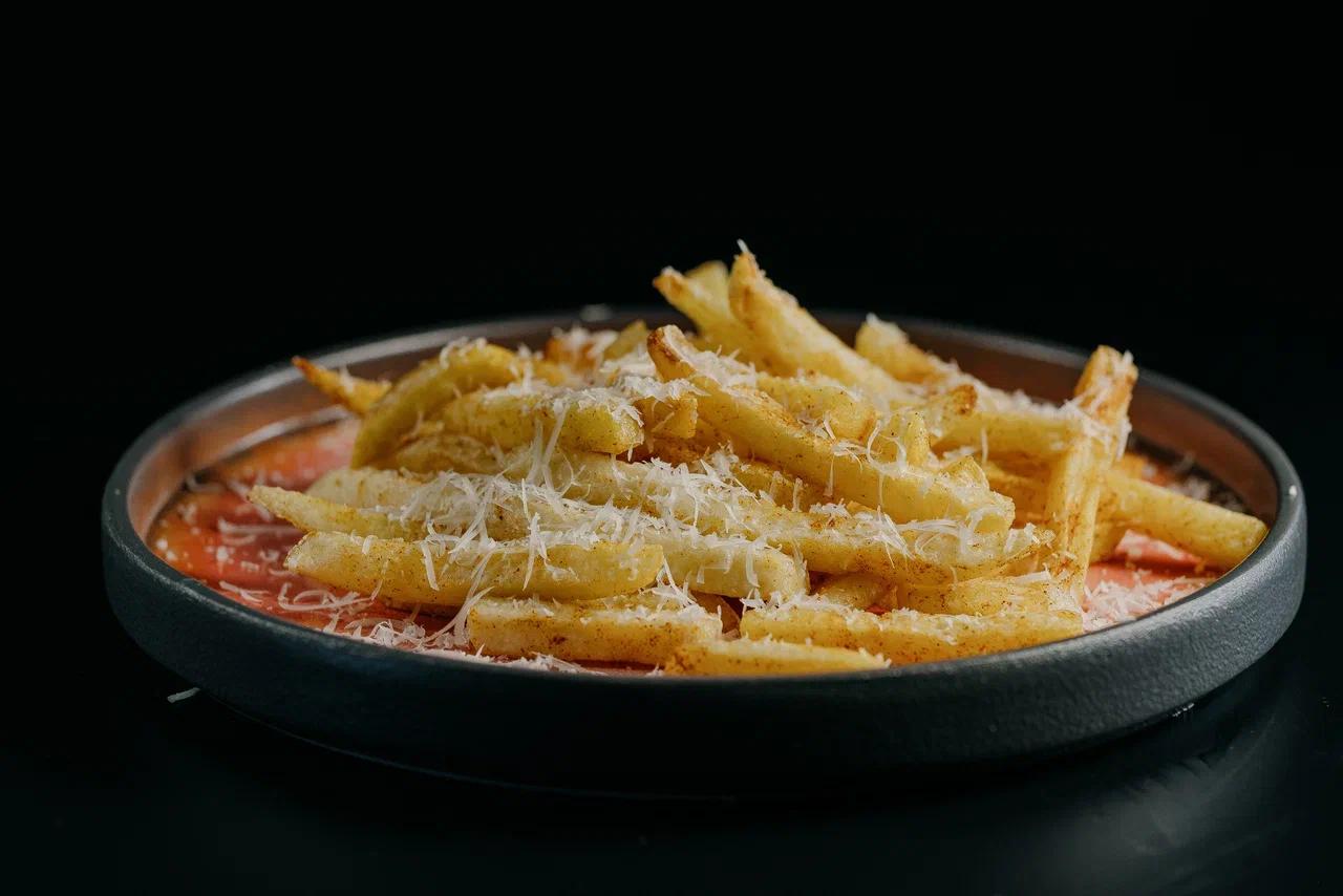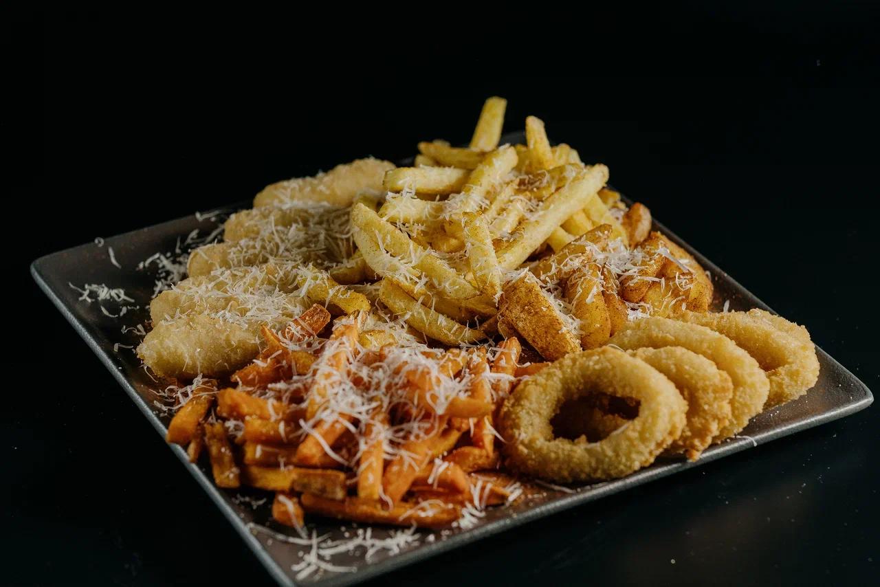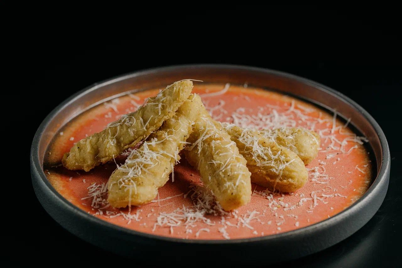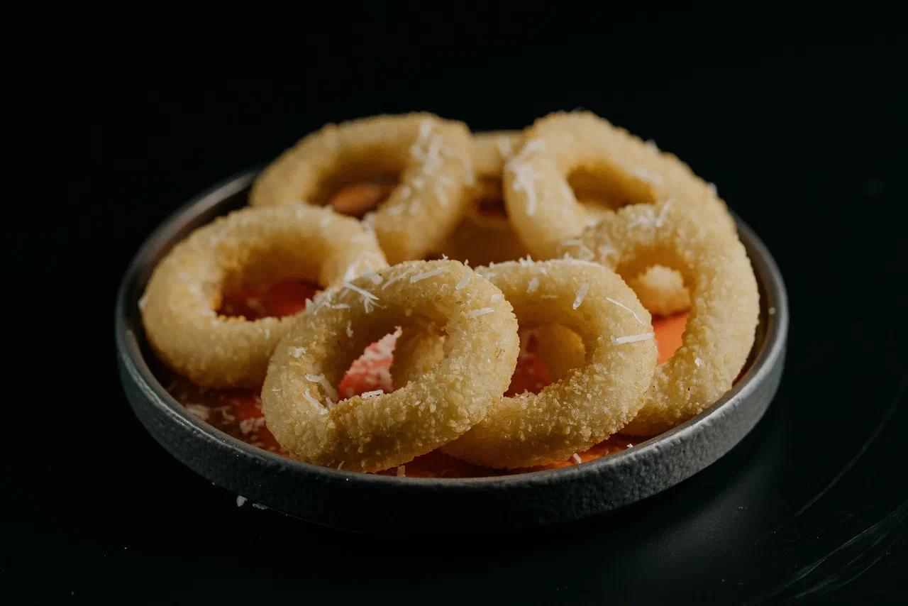 Обжаренные до золотистой корочки кольца лука с соусом.