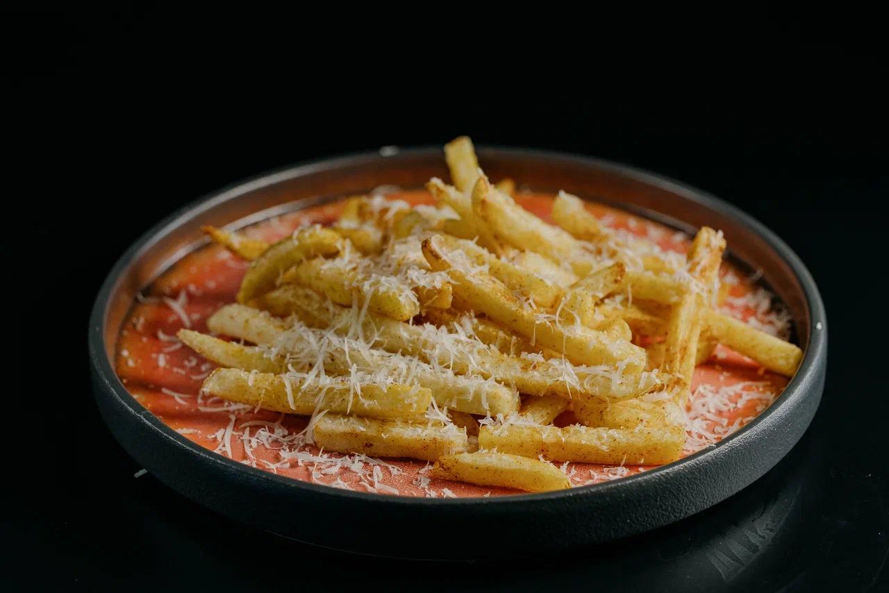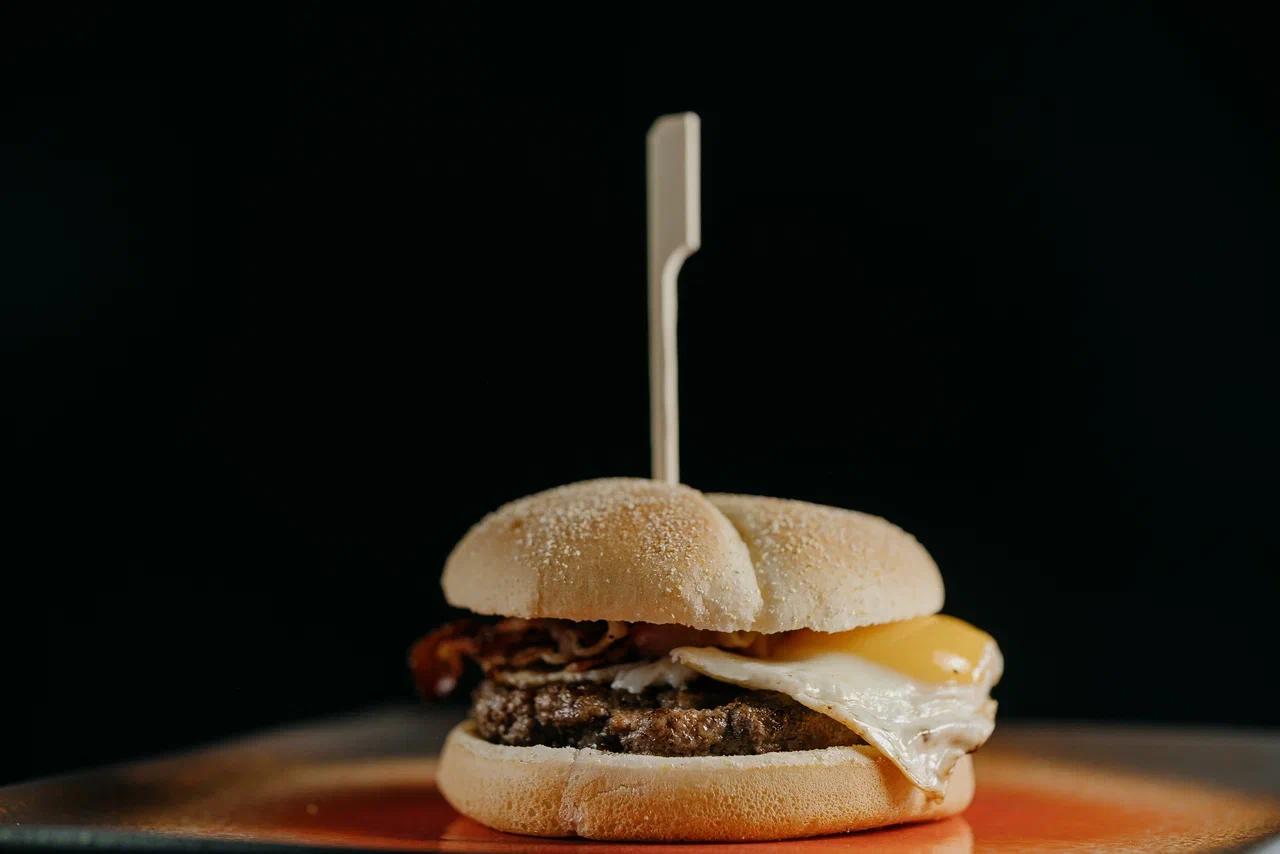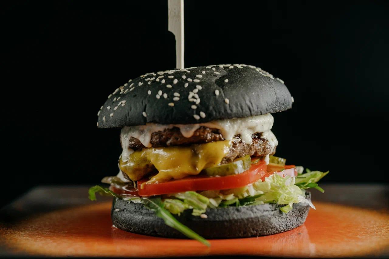 Премиум бургер с двумя котлетами из мраморной говядины, беконом, томатами, маринованными огурцами и соусом тар-тар на чёрной булочке.