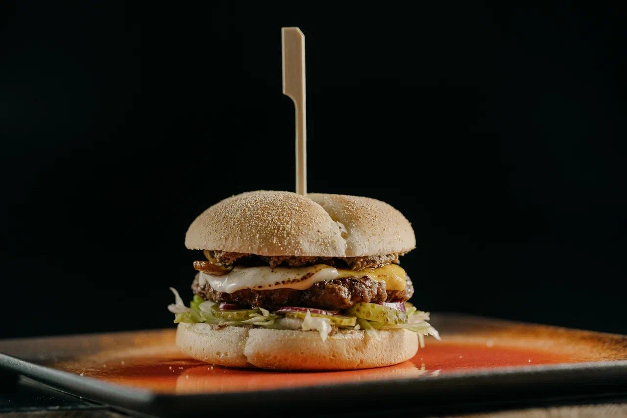 Бургер с котлетой из мраморной говядины и грибным соусом, маринованными огурцами, чеддером и моцареллой.