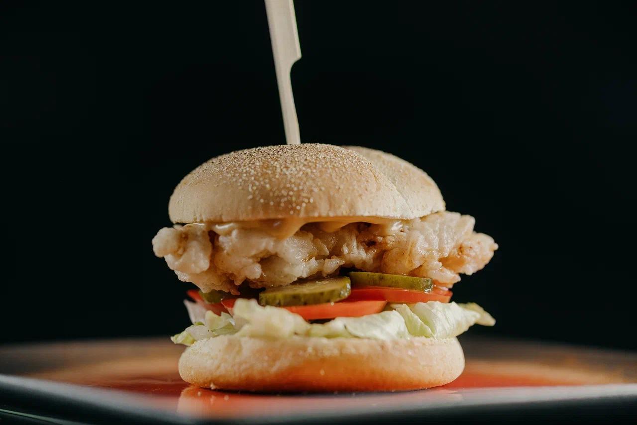 Бургер с куриным филе, томатами, маринованными огурцами и устричным айоле.